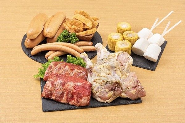 味付きポークバックリブ(カット) 500g / チキンレッグバジル 4本 800g / ホットドッグセット(ケチャップ付き) 4本 / 味付きポテト 300g / カットコーン 4個 / ジャンボマシュマロ 4個 ※写真は4人前