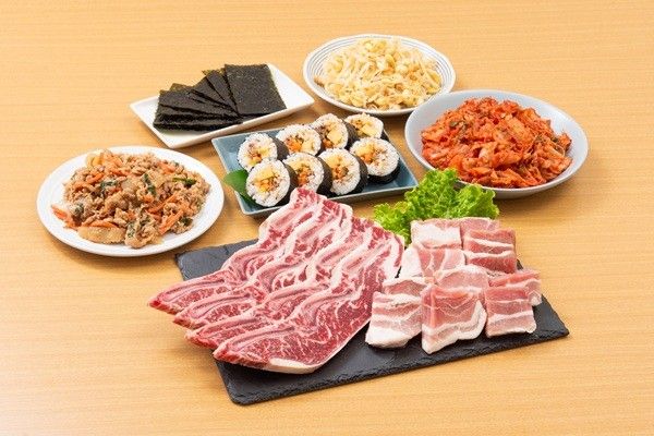 プルコギ 300g / サムギョプサル 300g / 骨付き牛カルビ(甘辛ダレ) 400g / 焼きキンパ 250g / もやしナムル 300g / キムチ 500g / コチュジャン・サムジャン 各2袋 / ごま油 / 韓国のり ※写真は4人前