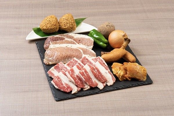 厚切り牛カルビ 100g / ガーリックポークステーキ 100g / 鶏ももタンドリー 50g / 骨付きフランク 1本 / 焼きおにぎり 1個 / 丸野菜セット3種 ※写真は2人前