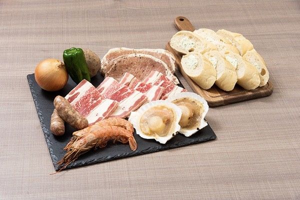 厚切り牛カルビ 100g / ガーリックポークステーキ 100g / 粗挽きソーセージ(香草ペッパー) 1本 / 有頭エビ 1尾 / 片貝ホタテ 1枚 / 丸野菜セット3種 / ガーリックバゲット ※写真は2人前
