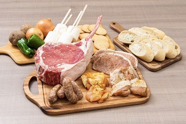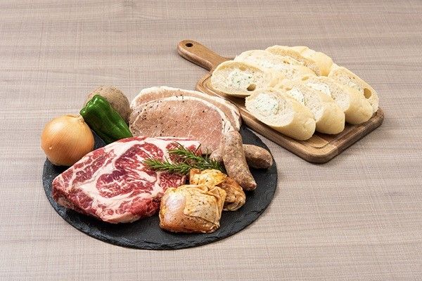 国産リブステーキ 1ポンド / 味付きポークバックリブ(カット) 500g / チキンレッグバジル 4本 800g / 粗挽きソーセージ(香草ペッパー) 4本 / 骨付きカルビ 400g ※写真は4人前