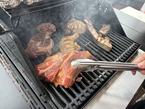 牛ランプステーキ 100g / スパイシースペアリブ 180g / 粗挽きソーセージ(香草ペッパー) 1本 / カットベーコン 50g / 丸野菜セット3種(ジャガイモ、ピーマン、玉ねぎ) 各0.5個 / ガーリックバゲット 0.5本 ※画像は2人前イメージです。