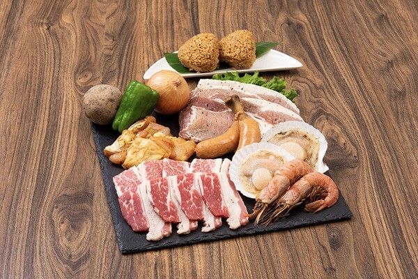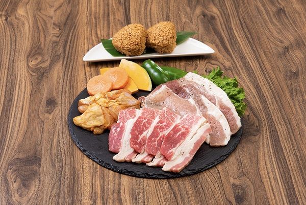 ※30人前から注文可 厚切り牛カルビ 100g / ガーリックポークステーキ 100g / 鶏ももタンドリー 100g / 骨付きフランク 50g / 焼きおにぎり 1個 / 有頭エビ 1尾 / 片貝ホタテ 1枚 / 丸野菜セット3種(ジャガイモ・ピーマン・玉ねぎ 各0.5個) ※写真は2人前